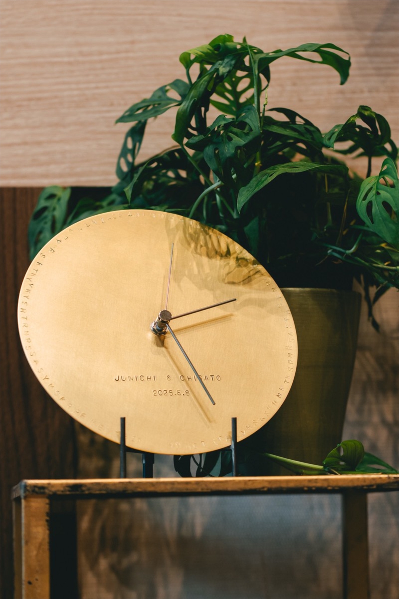 そして、ゲストの皆様に刻印していただいた真鍮時計の結婚証明書など、おふたりらしさ溢れる挙式となりました。