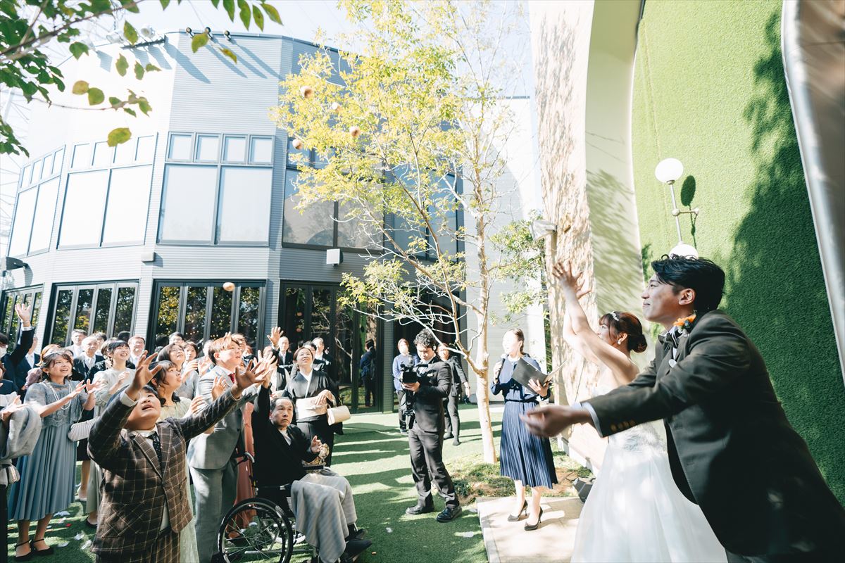挙式後のガーデンセレモニーは、ここでもおふたりの思い出を表現するため、夢の国での思い出のショーを再現し、お宝トス!