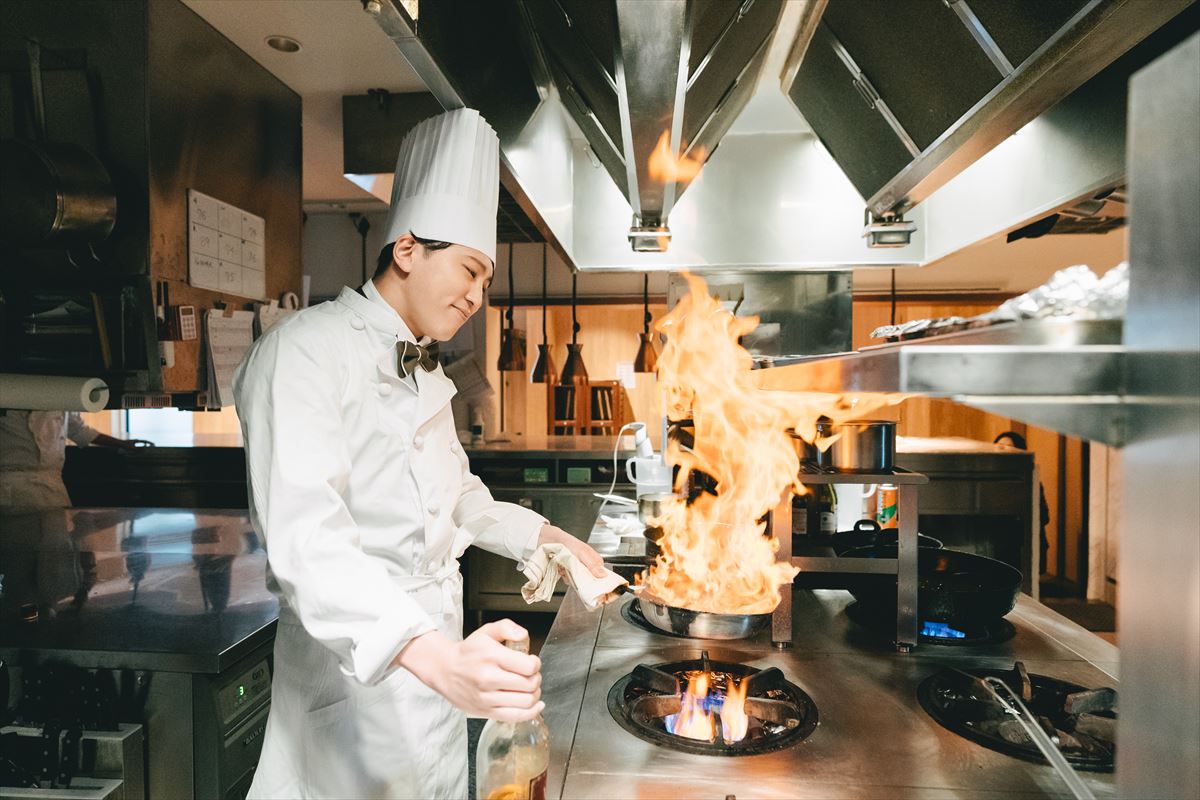 オープンキッチンの演出では、アコールハーブのキッチンからけんたさんがご登場し、かっこよくフランベ演出を行っていただきました!