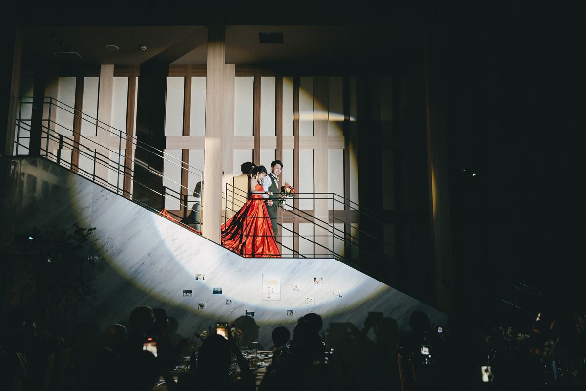 装い新たに、おふたりが2階から、ご入場です。